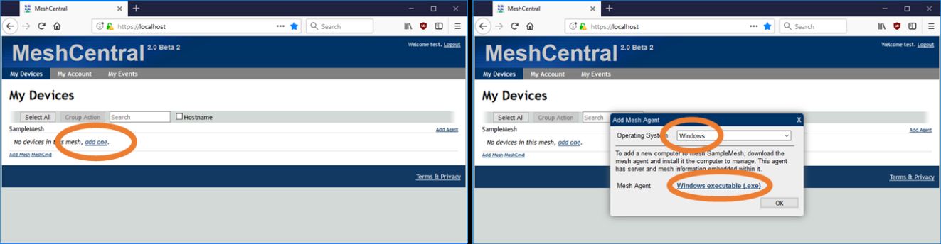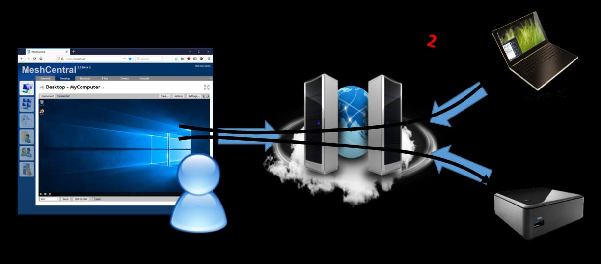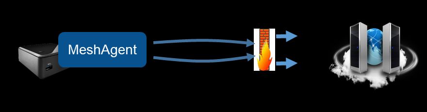 - Generates an agent and installs it on a target or each end-point that immediately attempts a connection back to MeshCentral server.