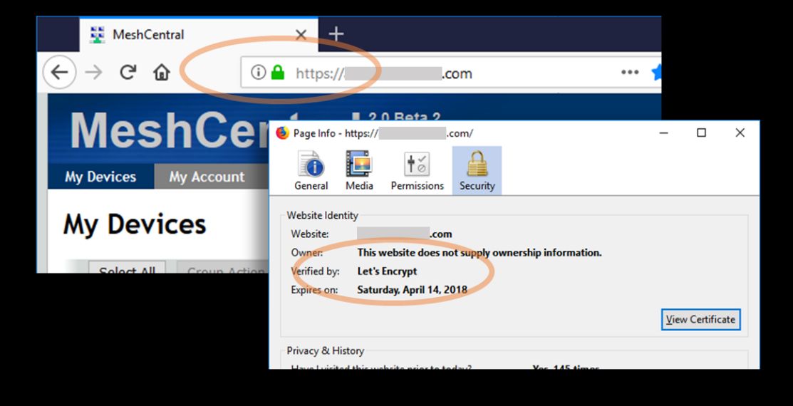 - If you own a domain name that points to your MeshCentral server, you can get a free trusted certificate using Let’s Encrypt (https://letsencrypt.org/). See the section on Let’s Encrypt in this document for more information on this option. MeshCentral has built-in support for Let’ Encrypt.
