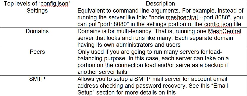 In this annex, we present a complete sample config.json file. You would put this file in the “meshcentral-data” folder that is created when MeshCentral is first run. The config.json is completely optional and the server will run with default values with it. All key names in this file are case insensitive.