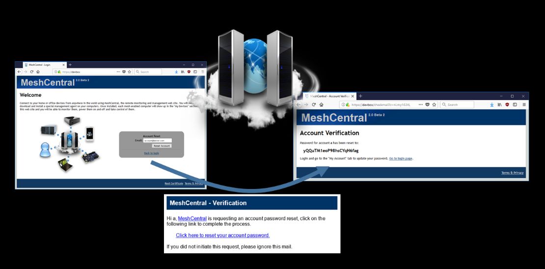 MeshCentral can be configured with an SMTP server to send out e-mail confirmation messages and password recovery message. This is an important feature that was missing in MeshCentral1.