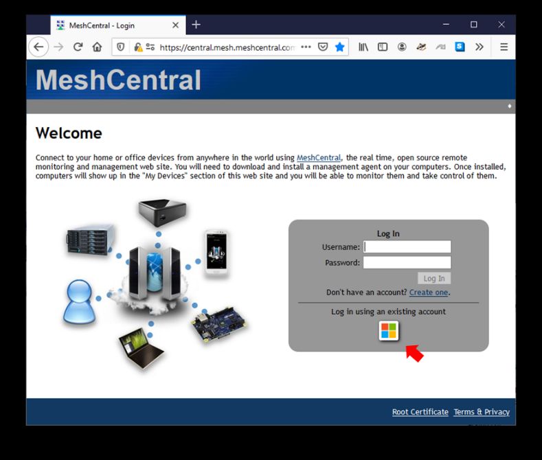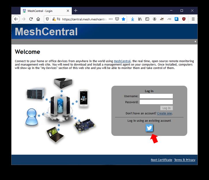 “webserver-cert-public.crt”file in the“meshcentral-data”folder of the server. - Add webserver’s root certificate into web browser’s trust list. Click on “Root Certificate” link at the bottom right of login page to download the root certificate of the web server and then add/import this as a trusted certificate into web browser. Some web browser may require a restart before the certificate installation takes effect.